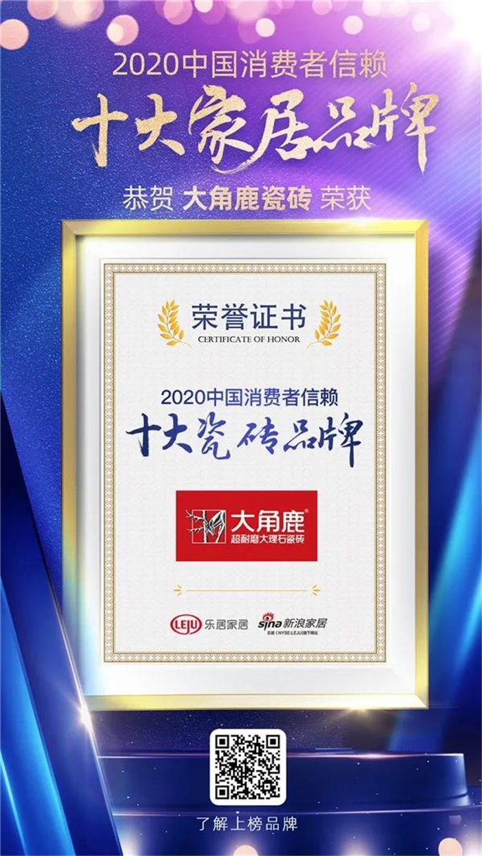 品牌实力!大角鹿荣获2020消费者信赖十大瓷砖品牌
