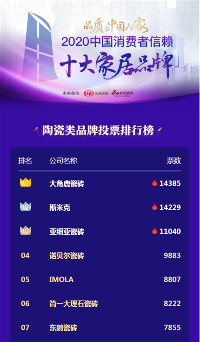 大角鹿稳居陶瓷类品牌投票排行榜第一名