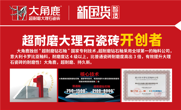 大角鹿,独创“超耐磨钻石釉”国家专利技术,超耐磨钻石釉采用全球第一的釉料公司,意大利卡罗比亚釉料,耐磨度达4级以上,比普通瓷砖耐磨度高出3倍。截止11月6日,2020年天9国际手机版登录 已成功新开拓373家专卖店,全国1057家专卖店