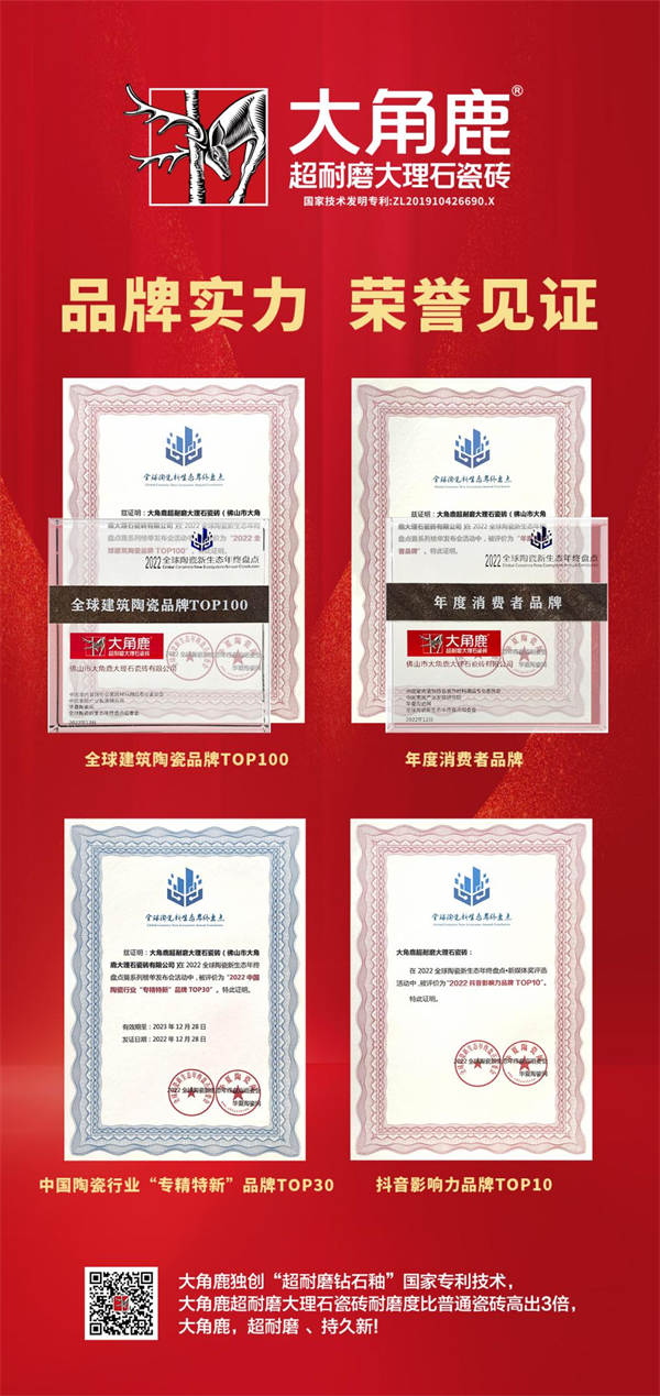 作为超耐磨大理石瓷砖发明者,大角鹿坚持技术创新,致力于超耐磨陶瓷新材料的研发与生产,引领超耐磨大理石瓷砖从无到有、由弱变强、从中国走向全球的发展历程。未来,大角鹿将继续加快发展的步伐,让大角鹿瓷砖遍布全球,成为中国瓷砖走向全球的第一品牌。