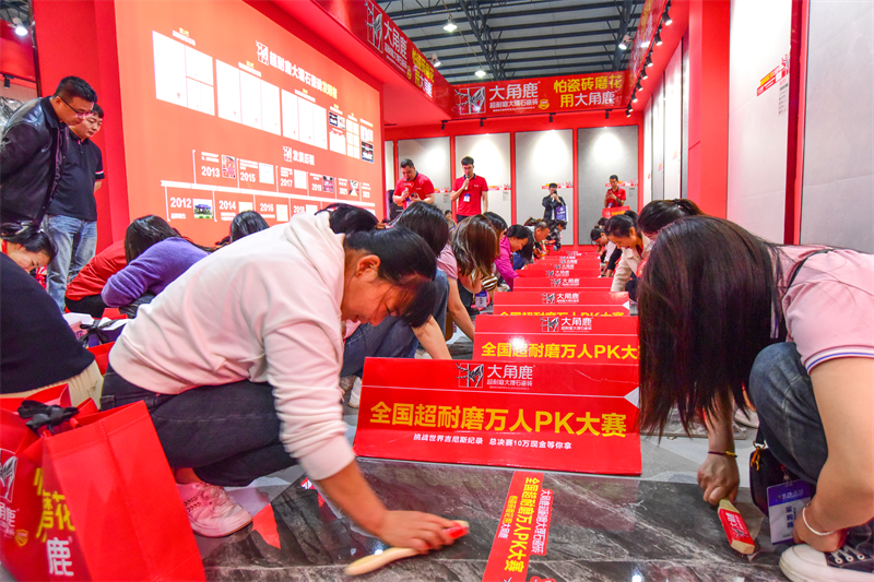 “怕瓷砖磨花,用大角鹿”。大角鹿品质过硬,不怕挑战,在高安陶博会现场发起“超耐磨万人PK大赛”,吸引万千观展客商慕名涌入大角鹿展位,现场亲自用钢刷在大角鹿瓷砖上大力摩擦,亲身体验大角鹿硬核超耐磨实力!