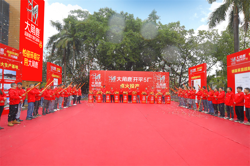 红红火火 产销两旺!在熊熊炉火和鞭炮声中,大角鹿开平5厂正式点火投产。大角鹿创始人南顺芝鼓励全体员工全力以赴,努力奋斗,让大角鹿瓷砖从中国增长王到全球增长王。