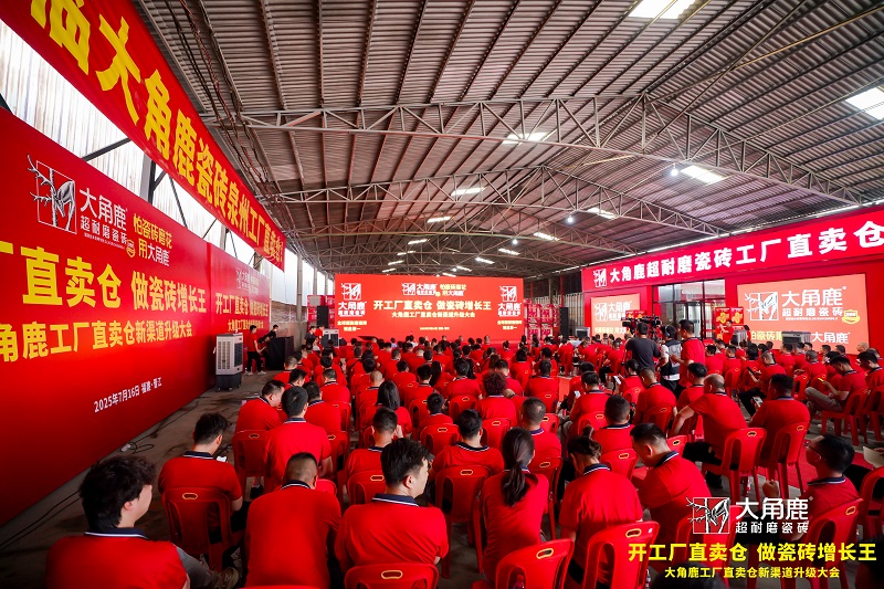 2025年7月16日,“开工厂直卖仓,做瓷砖增长王——大角鹿工厂直卖仓新渠道升级大会”在福建晋江隆重举行。行业领导专家、新浪家居、搜狐家居等30多家行业主流媒体,以及300多位大角鹿家人们齐聚现场,共同见证大角鹿渠道模式重磅升级,引领中国瓷砖增长新红利。
