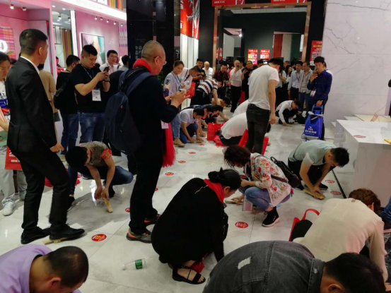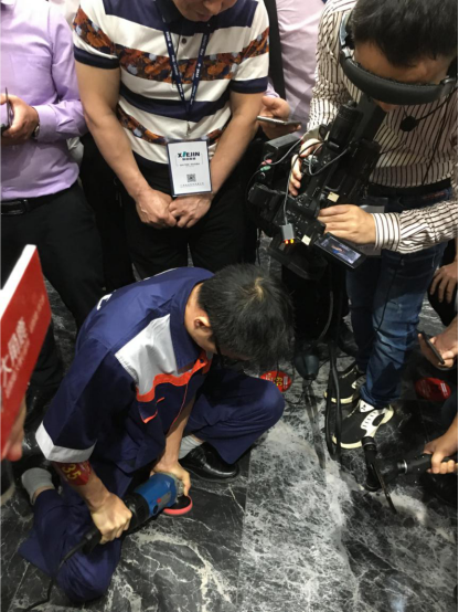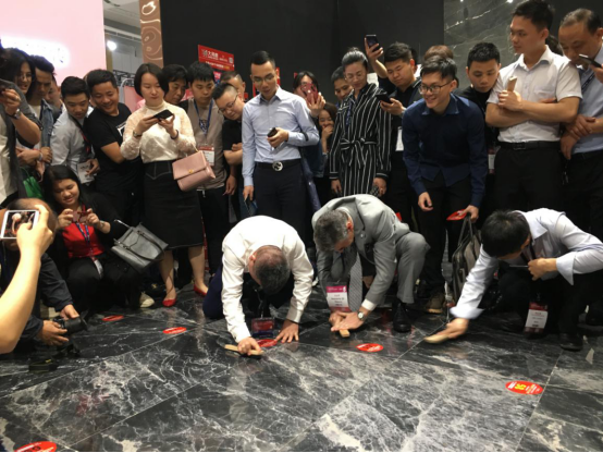 全球第一的釉料公司意大利卡罗比亚公司总经理Nazzario Di Mauro狄马罗和大角鹿董事长南顺芝一起参与天九国际娱乐网站网址查询 耐磨PK大赛,南总通过用力刷和使劲踩钢刷这种破坏力很强的动作告诉大家大角鹿到底有多耐磨。