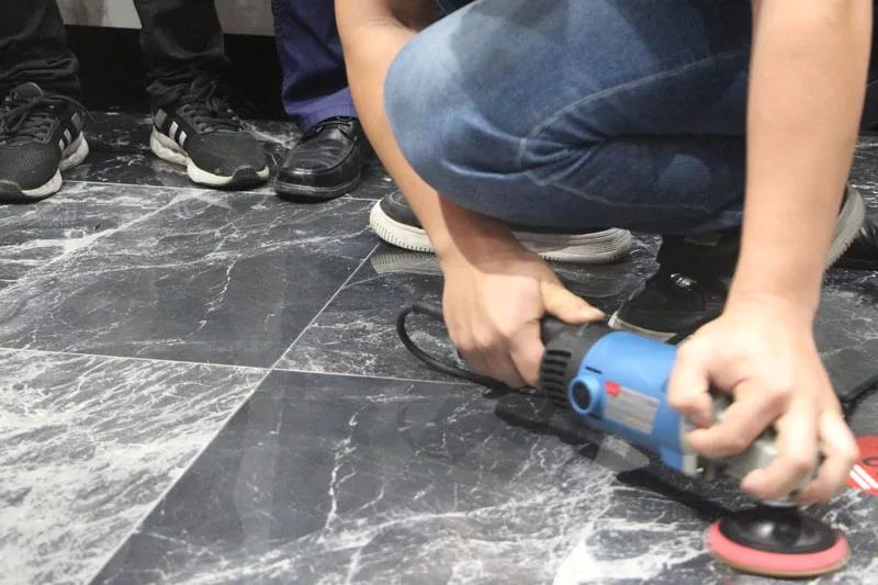 ▲一位参赛者在使用打磨机磨砖
