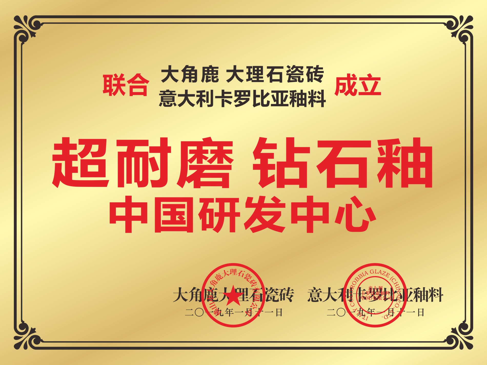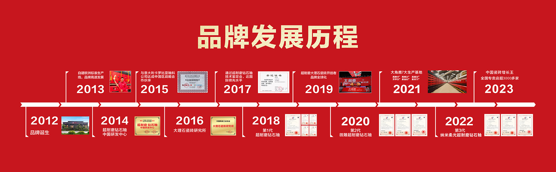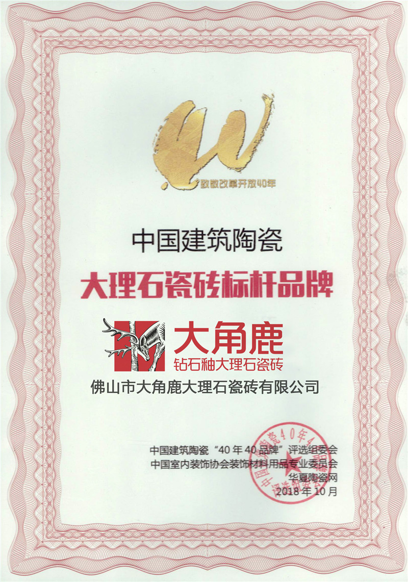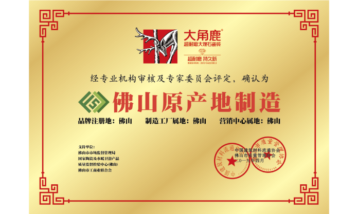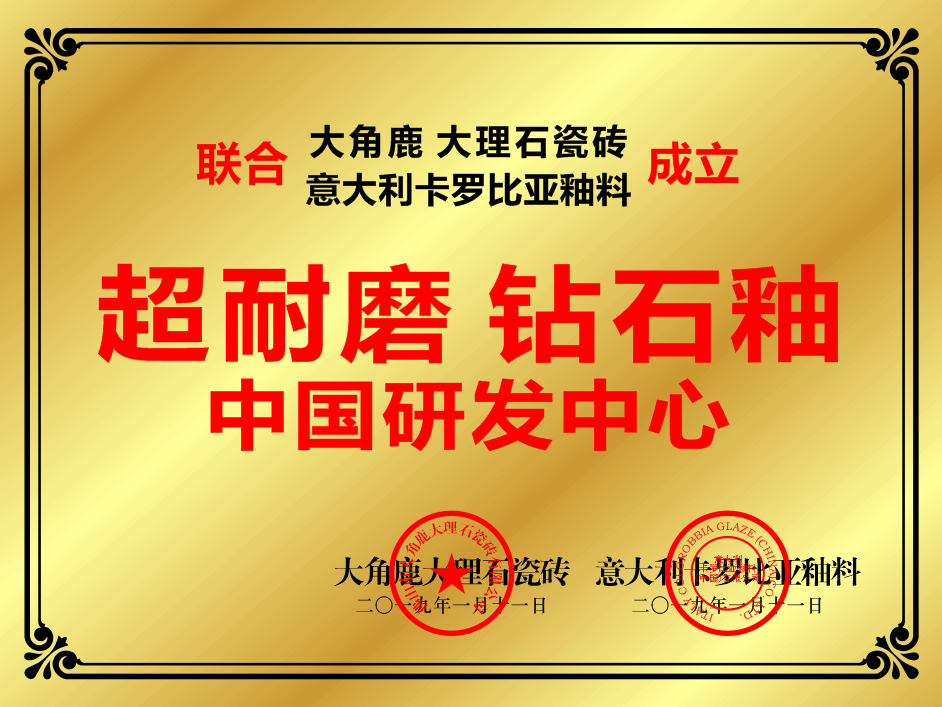 大角鹿专注于高品质超耐磨大理石瓷砖的研发、设计、生产与应用,在中国瓷砖绿色环保示范基地——广东佛山、广东开平、广东新丰、马来西亚等设有全球六大生产基地,拥有中国陶瓷工业协会授予的“中国超耐磨陶瓷新材料研究院”和“大理石瓷砖研究所”、中国建筑卫生陶瓷协会授予的“超耐磨陶瓷新材料研究中心”、联合意大利卡罗比亚釉料公司成立的“超耐磨钻石釉中国研发中心”四大研发中心以及中国建筑材料流通协会授予的“中国超耐磨陶瓷新材料示范基地”。